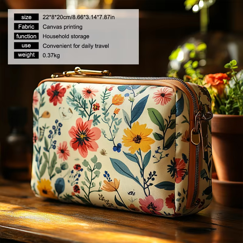 印花帆布洗漱用品收纳化妆包是那些在日常生活中注重便利和井然有序的人的必备配件。这款化妆包的设计兼顾了功能性和风格,非常适合在家中或旅途中整齐地摆放洗漱用品和个人物品。